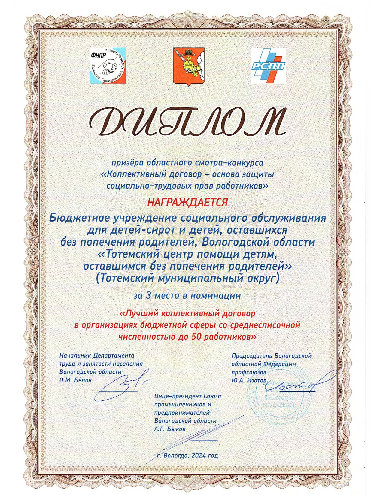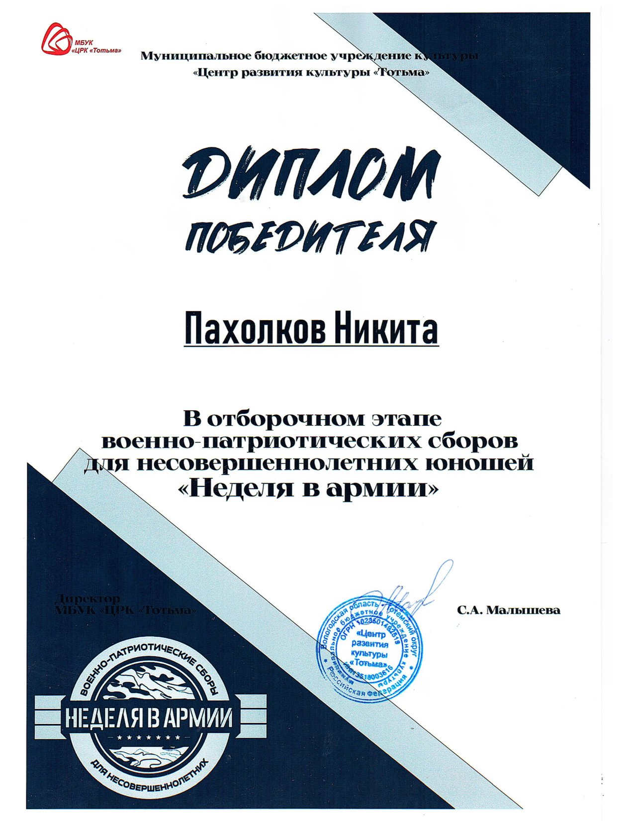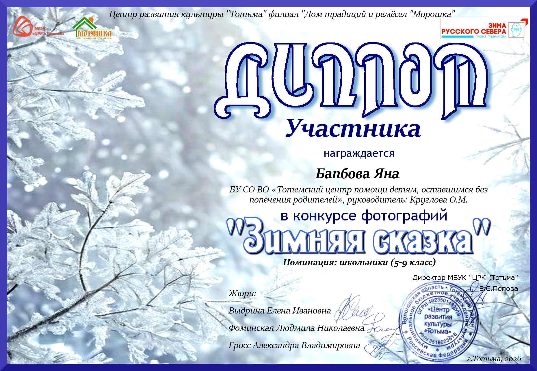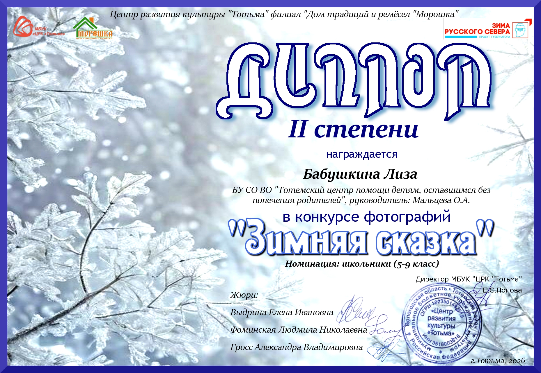 Благодарность ОМВД России по Тотемскому району (декабрь 2023 года)