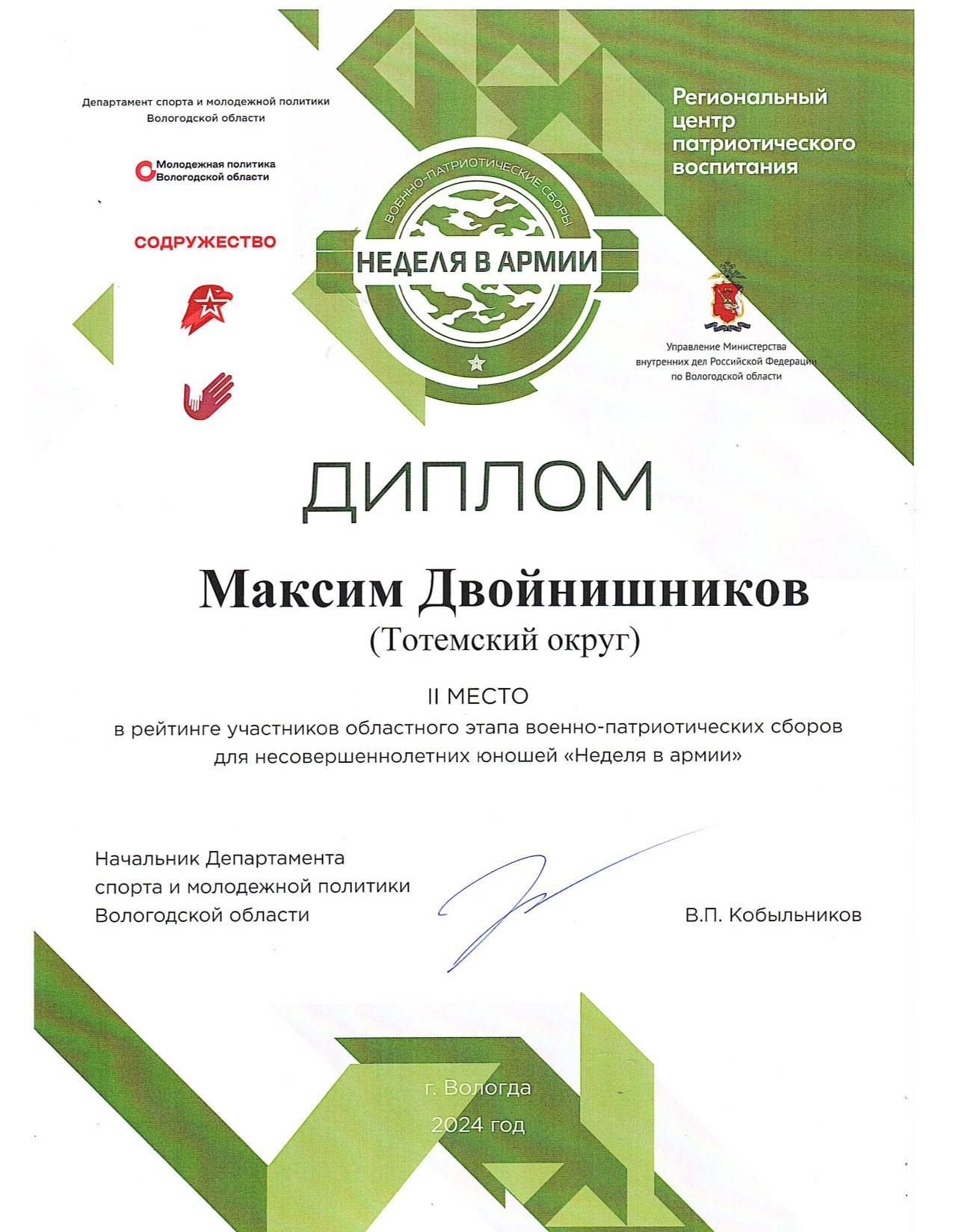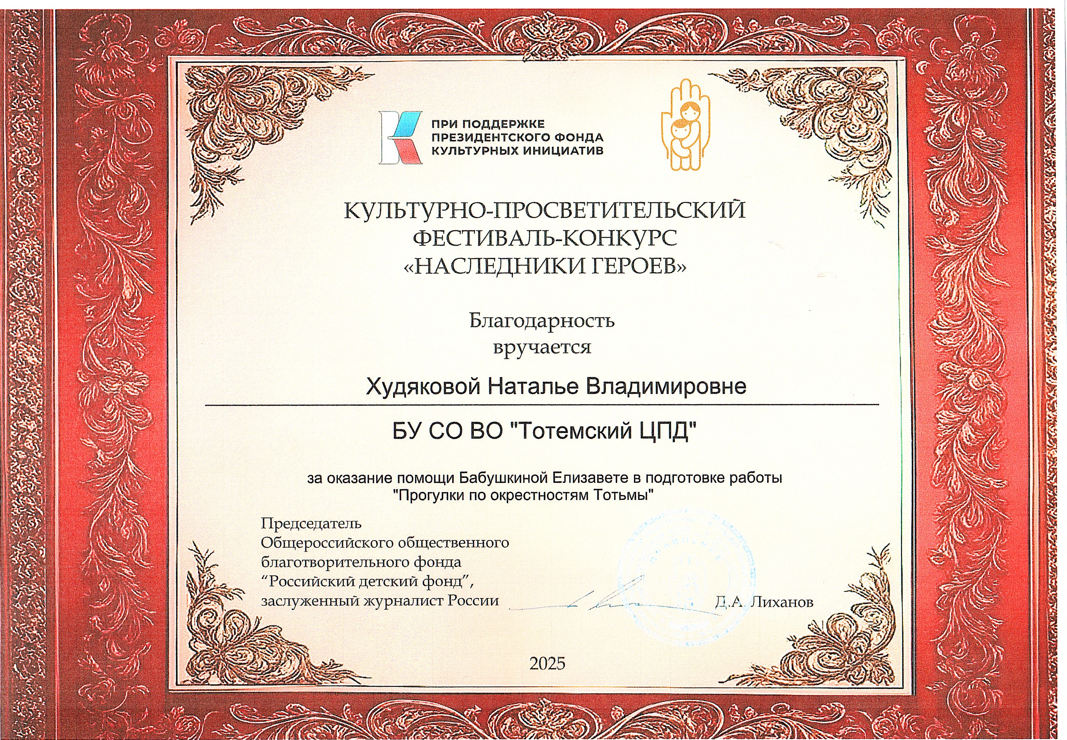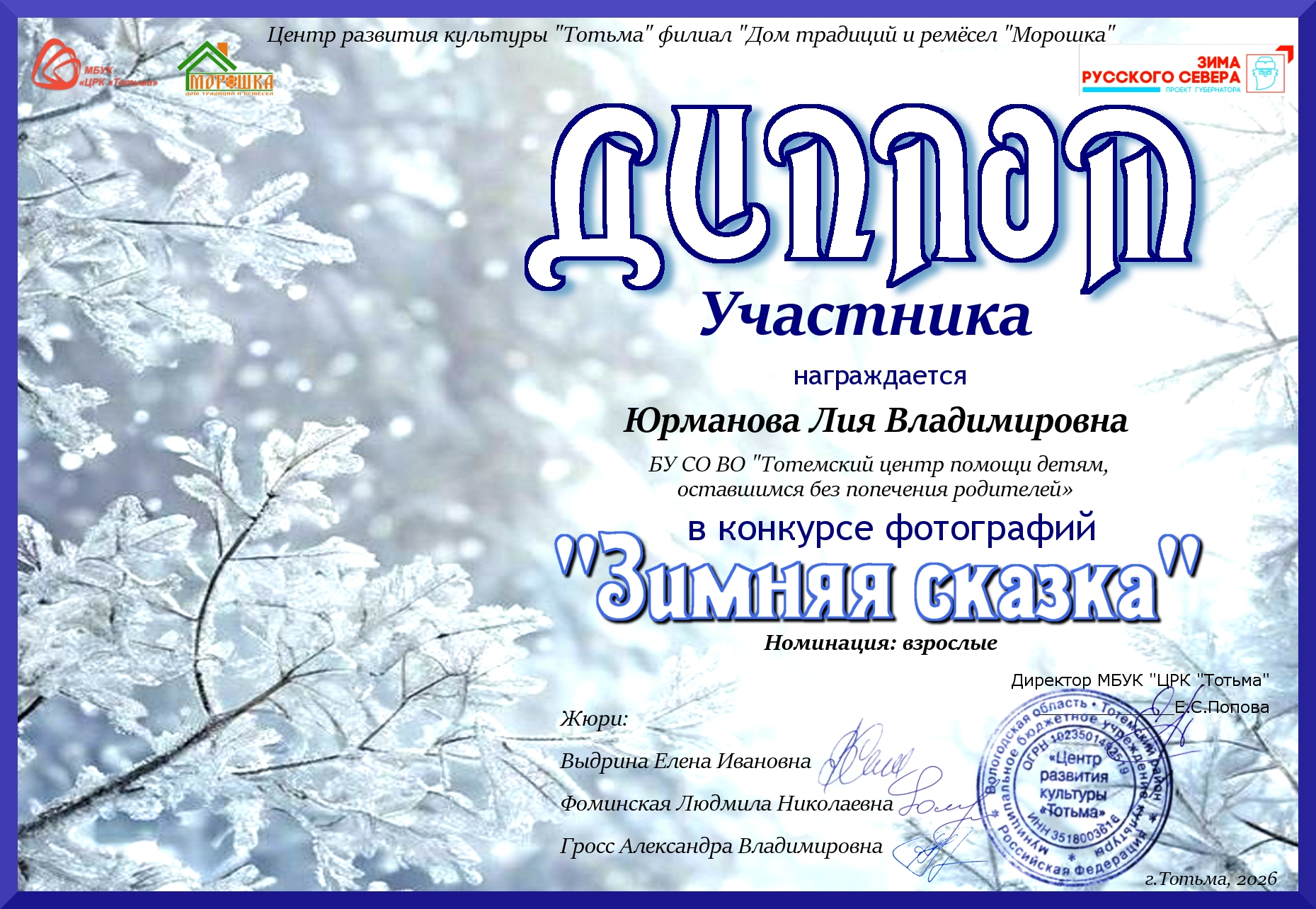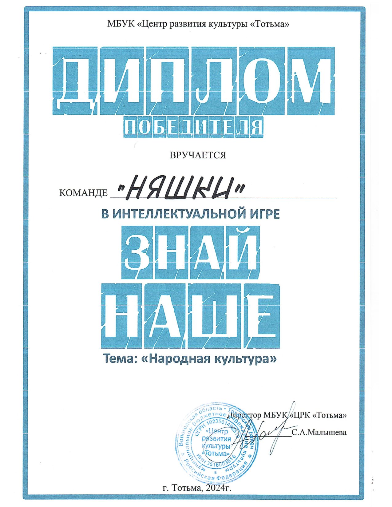 Благодарность ОМВД России по Тотемскому району (декабрь 2023 года)