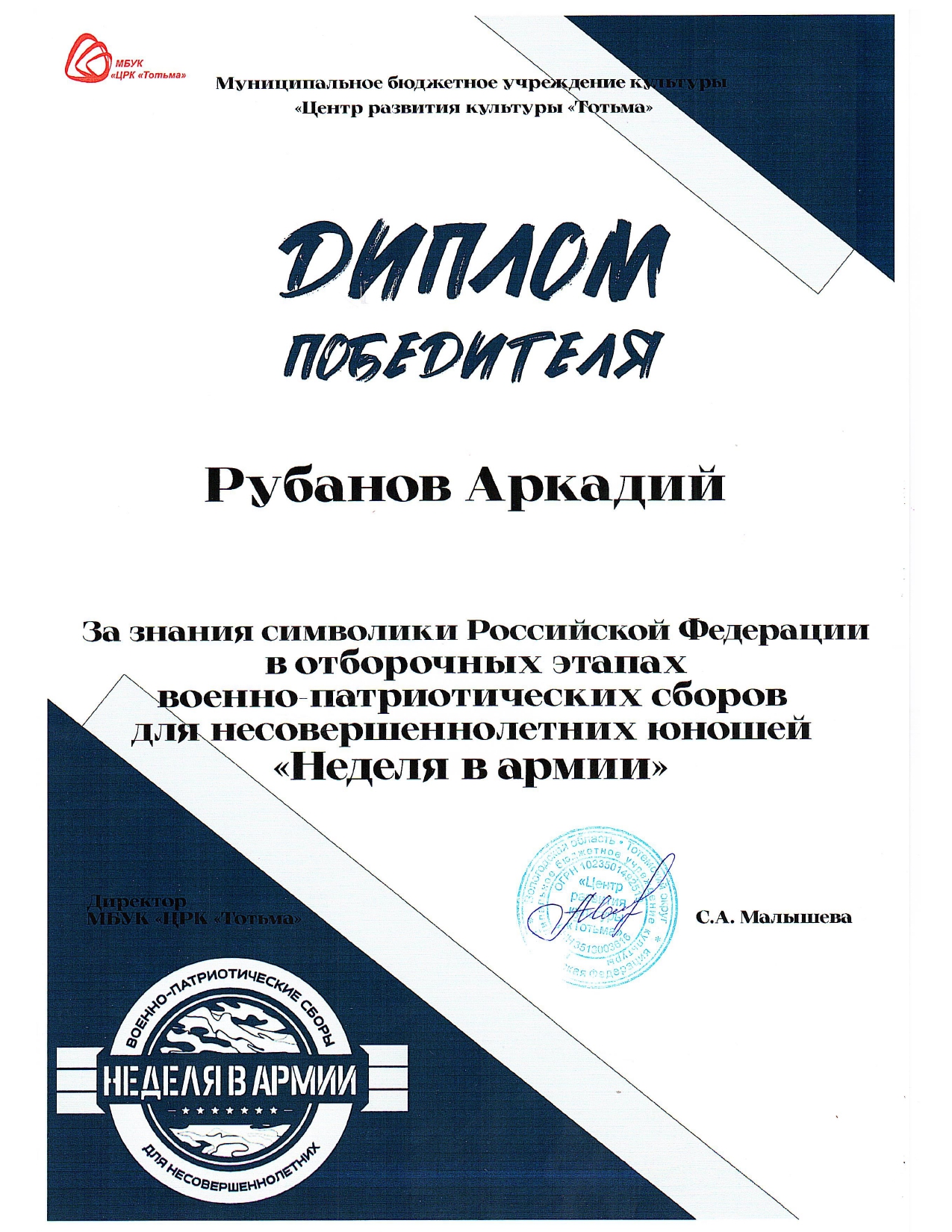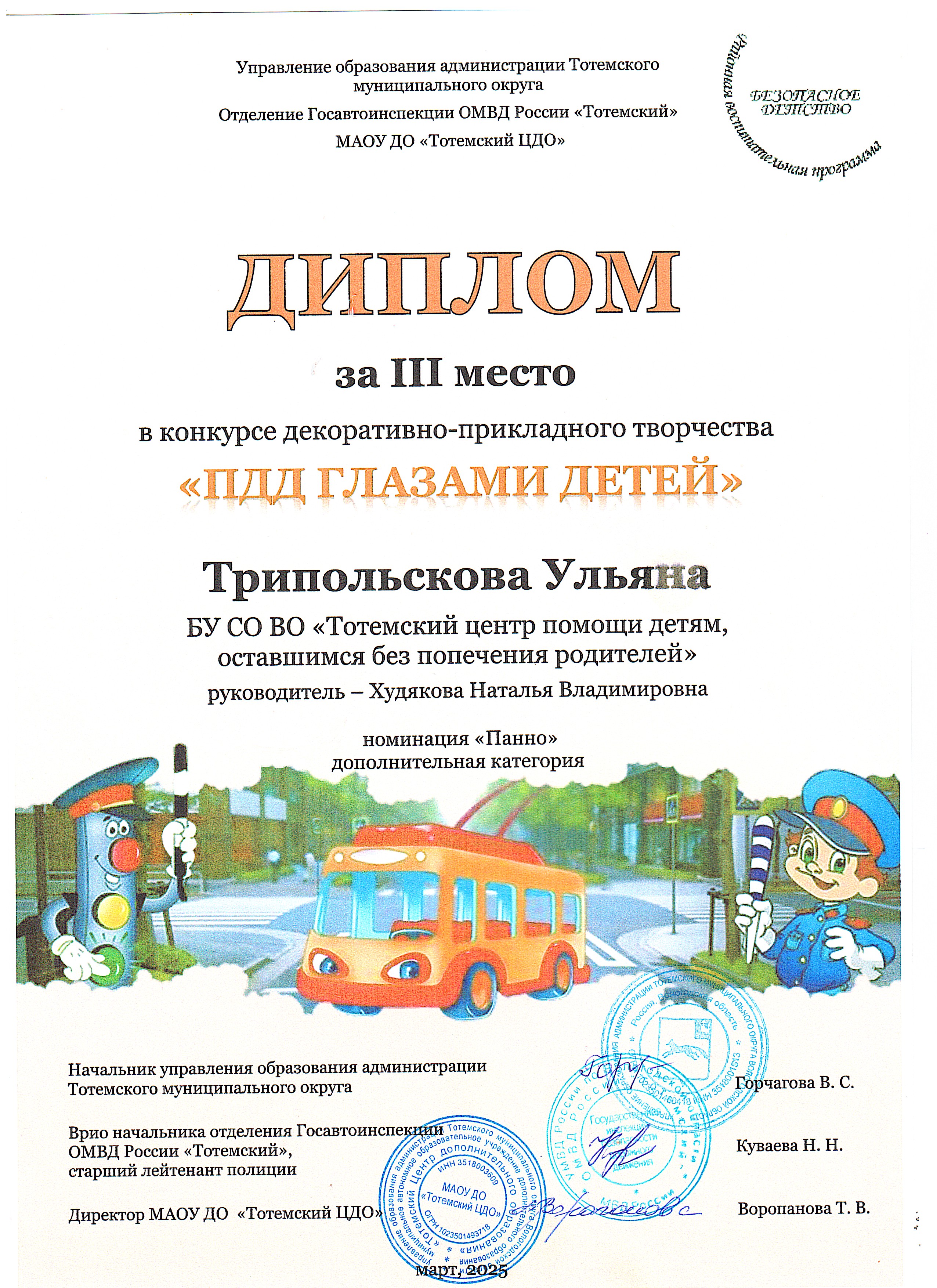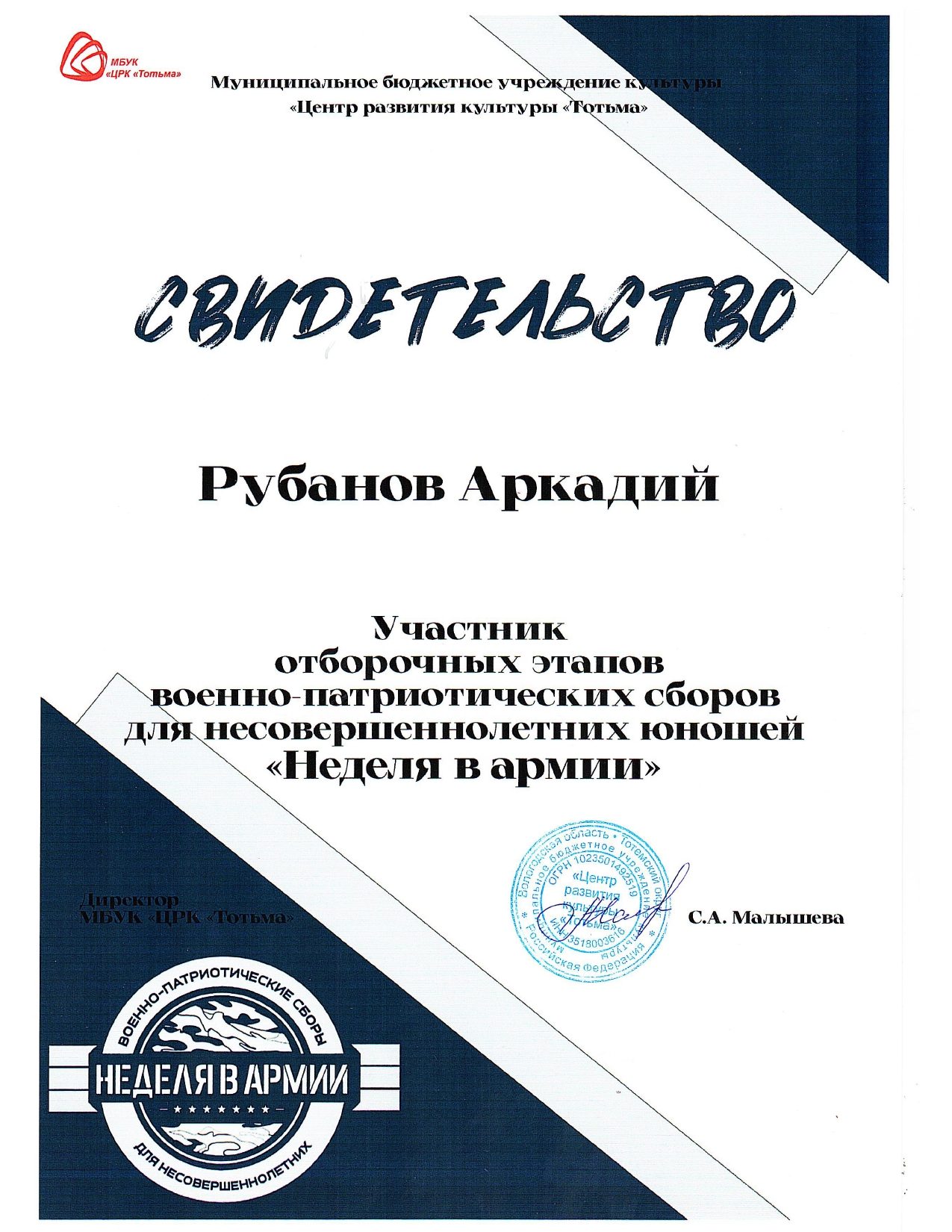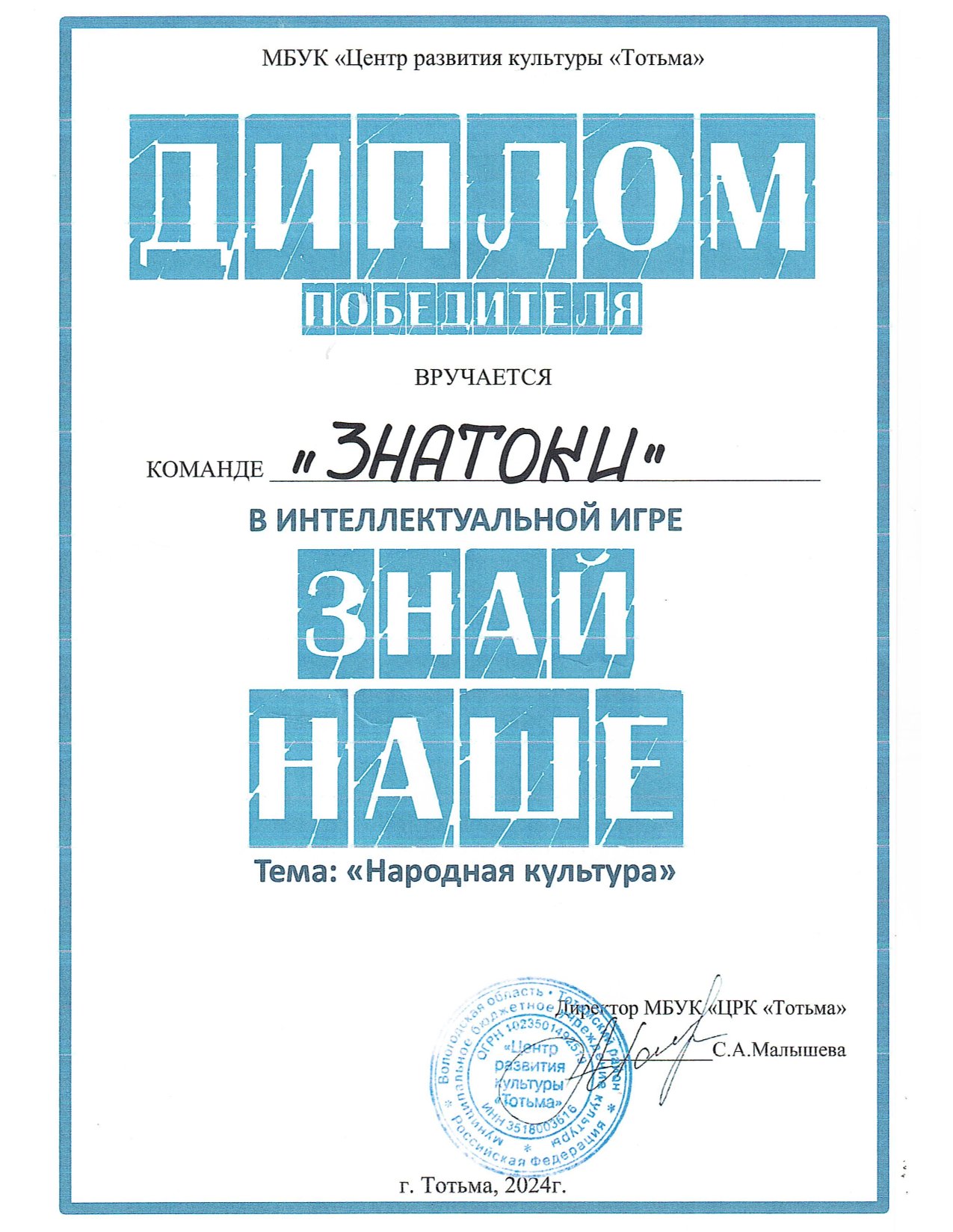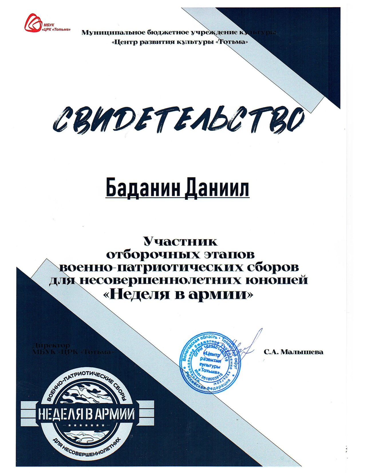 Благодарность ОМВД России по Тотемскому району (декабрь 2023 года)