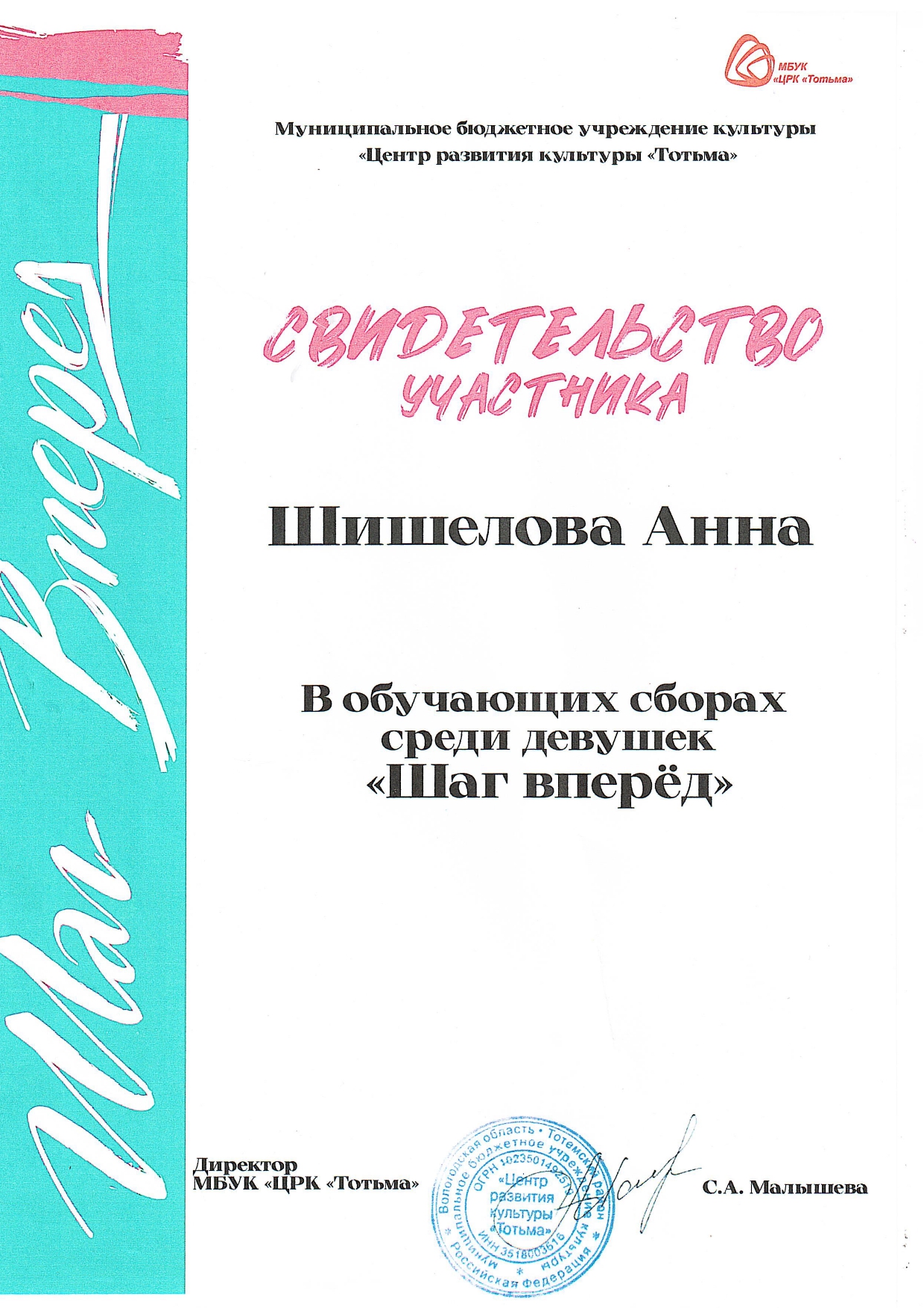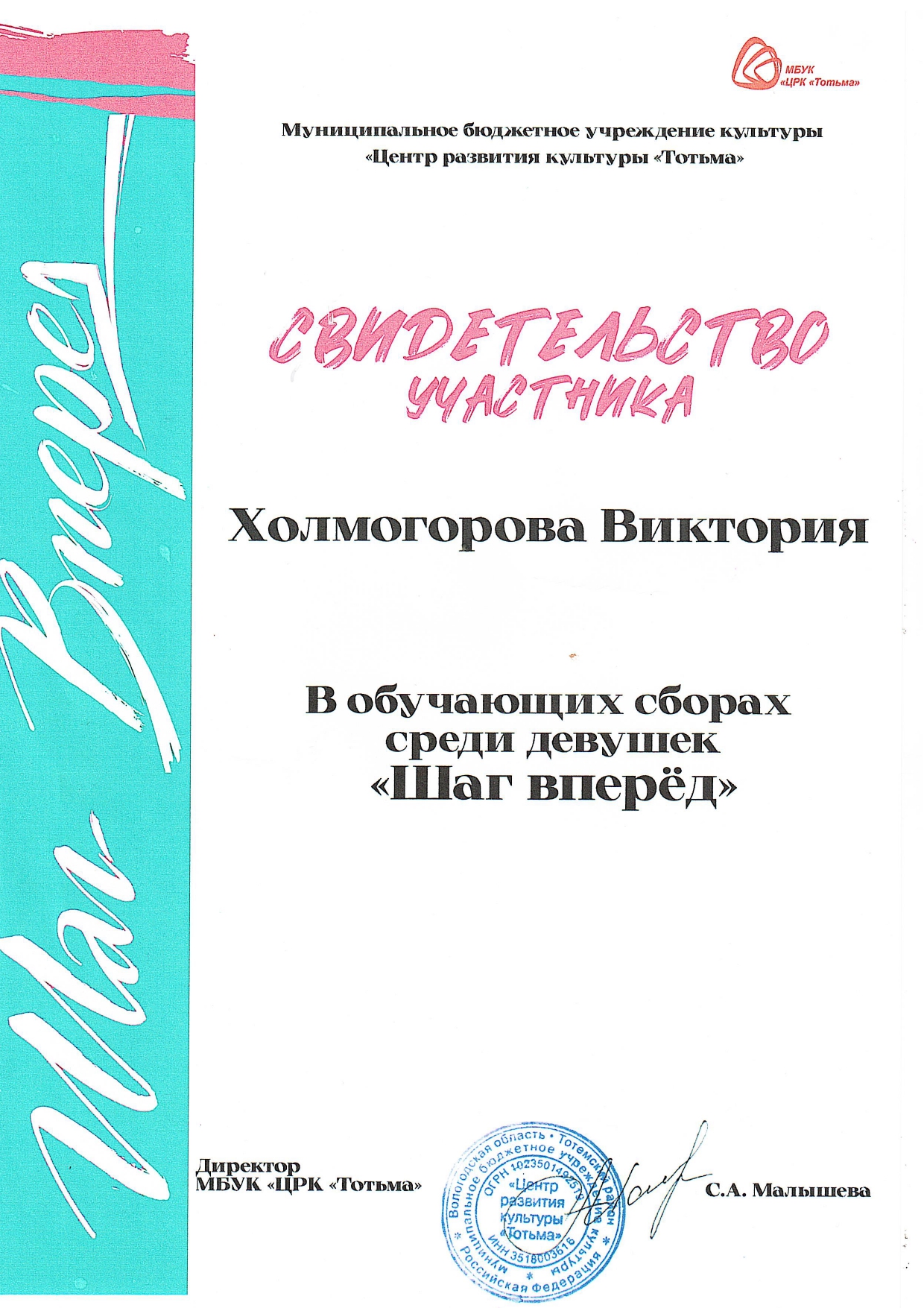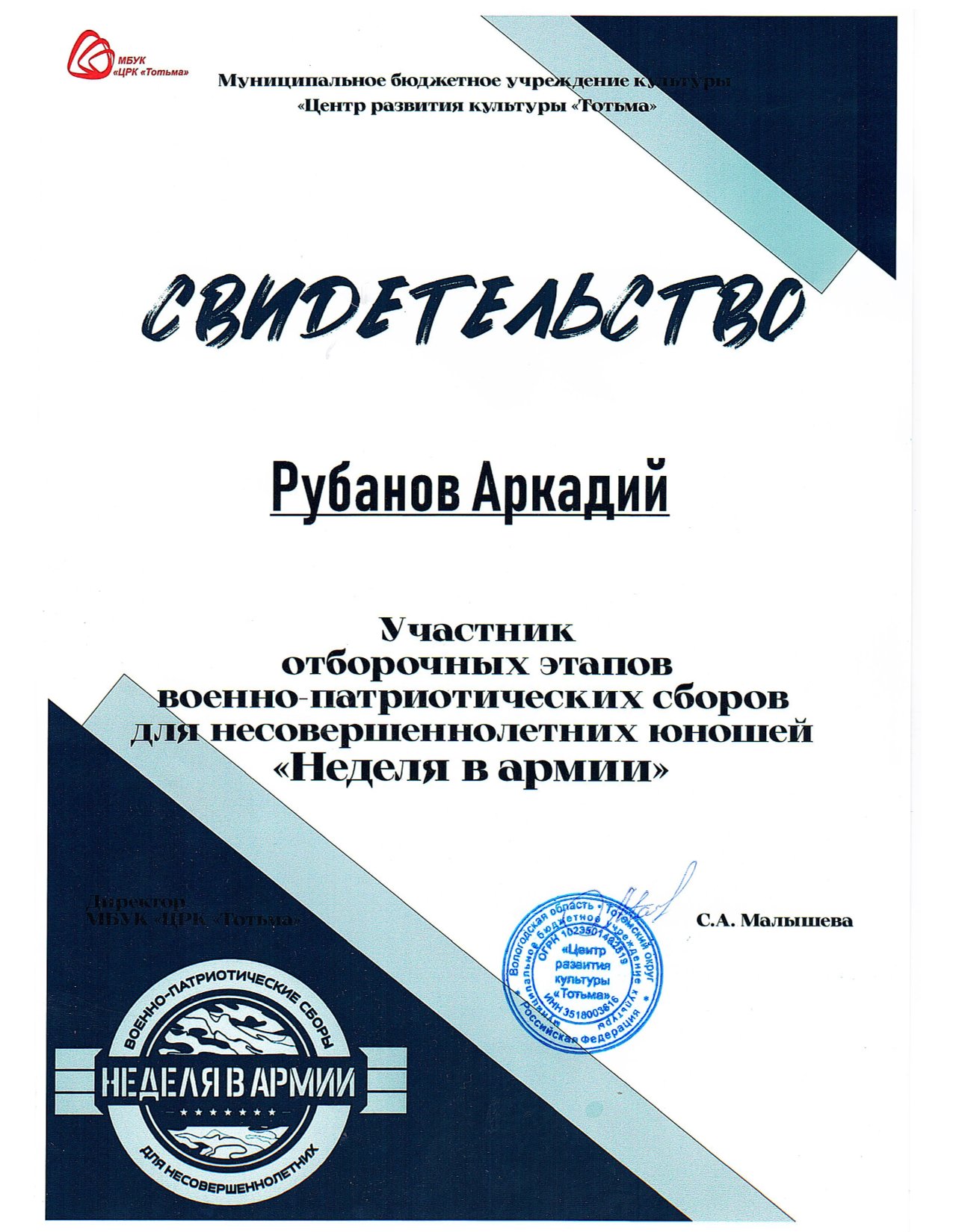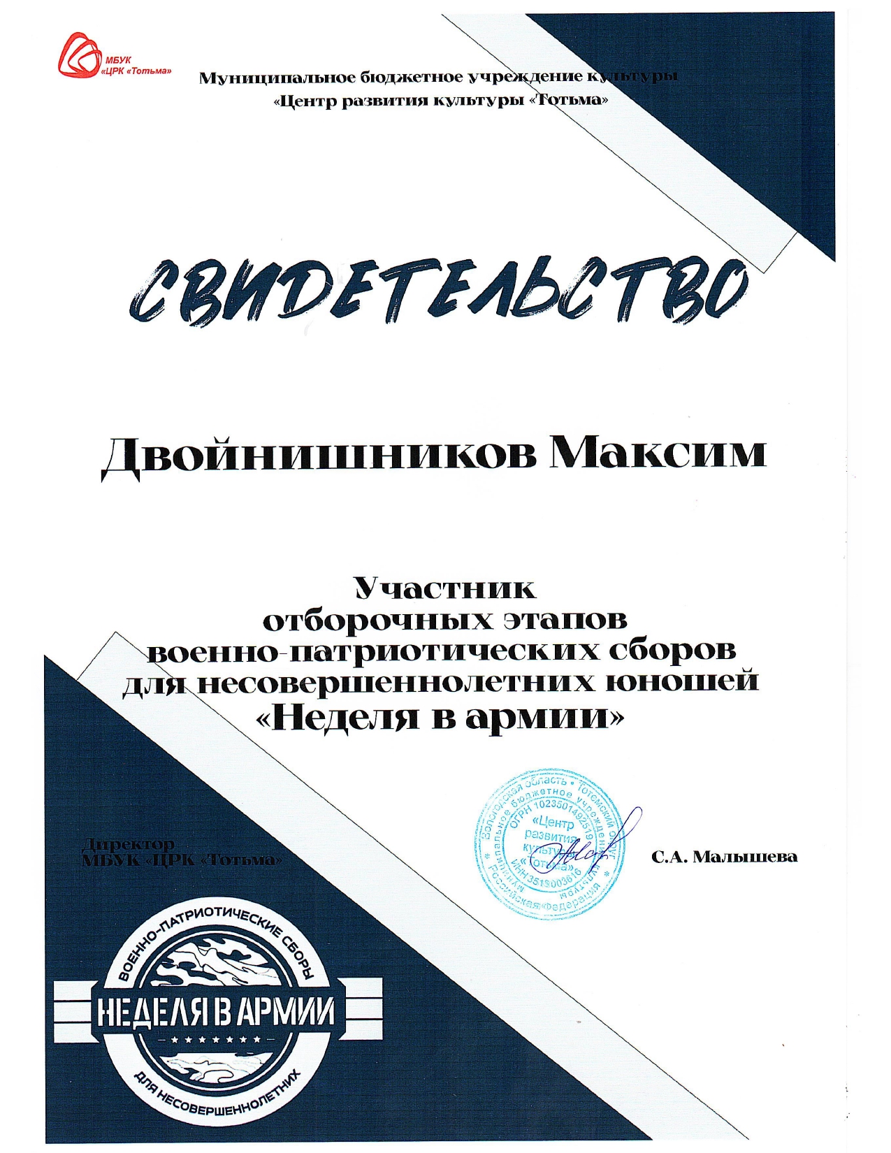 Благодарность ОМВД России по Тотемскому району (декабрь 2023 года)
