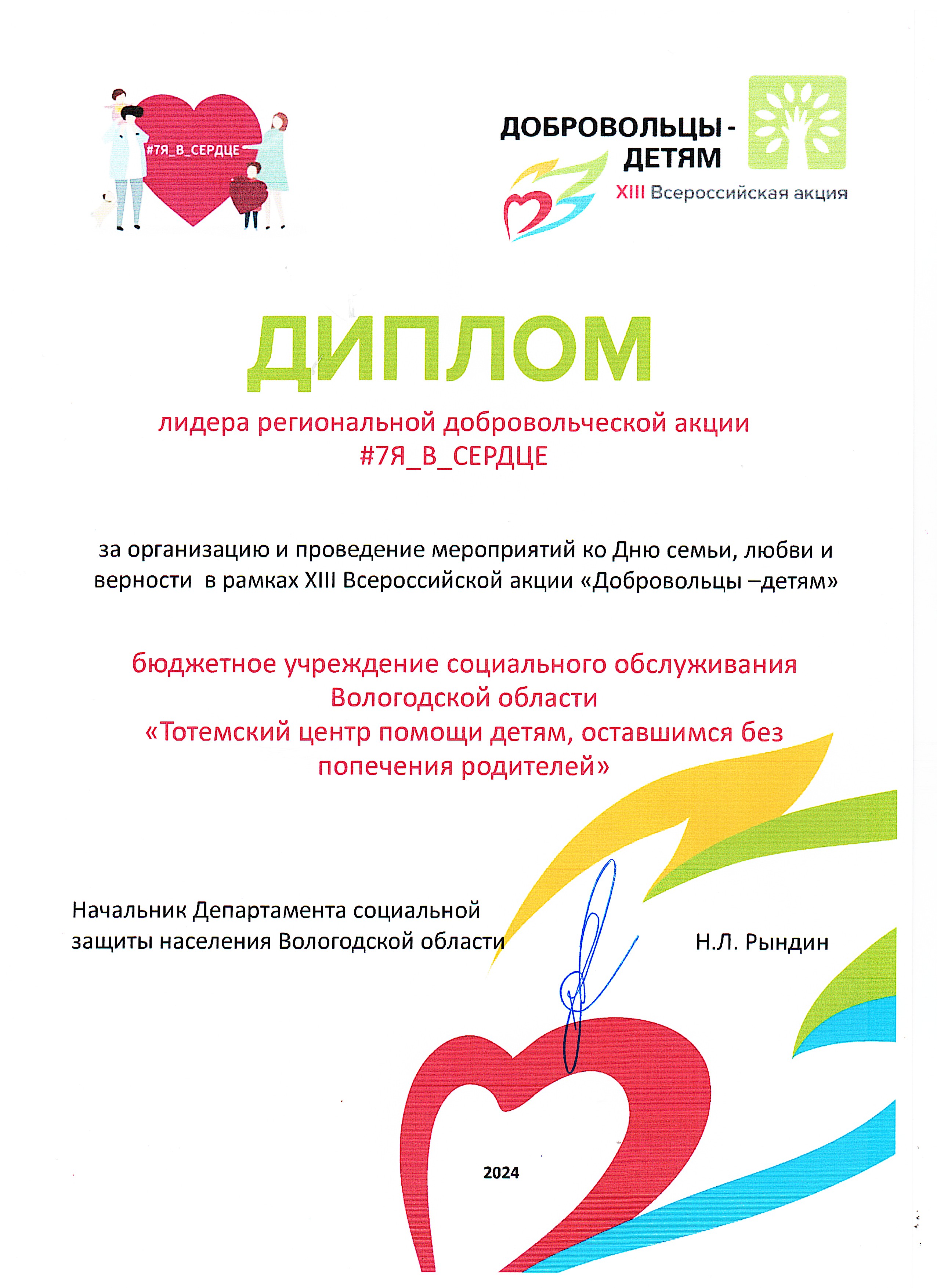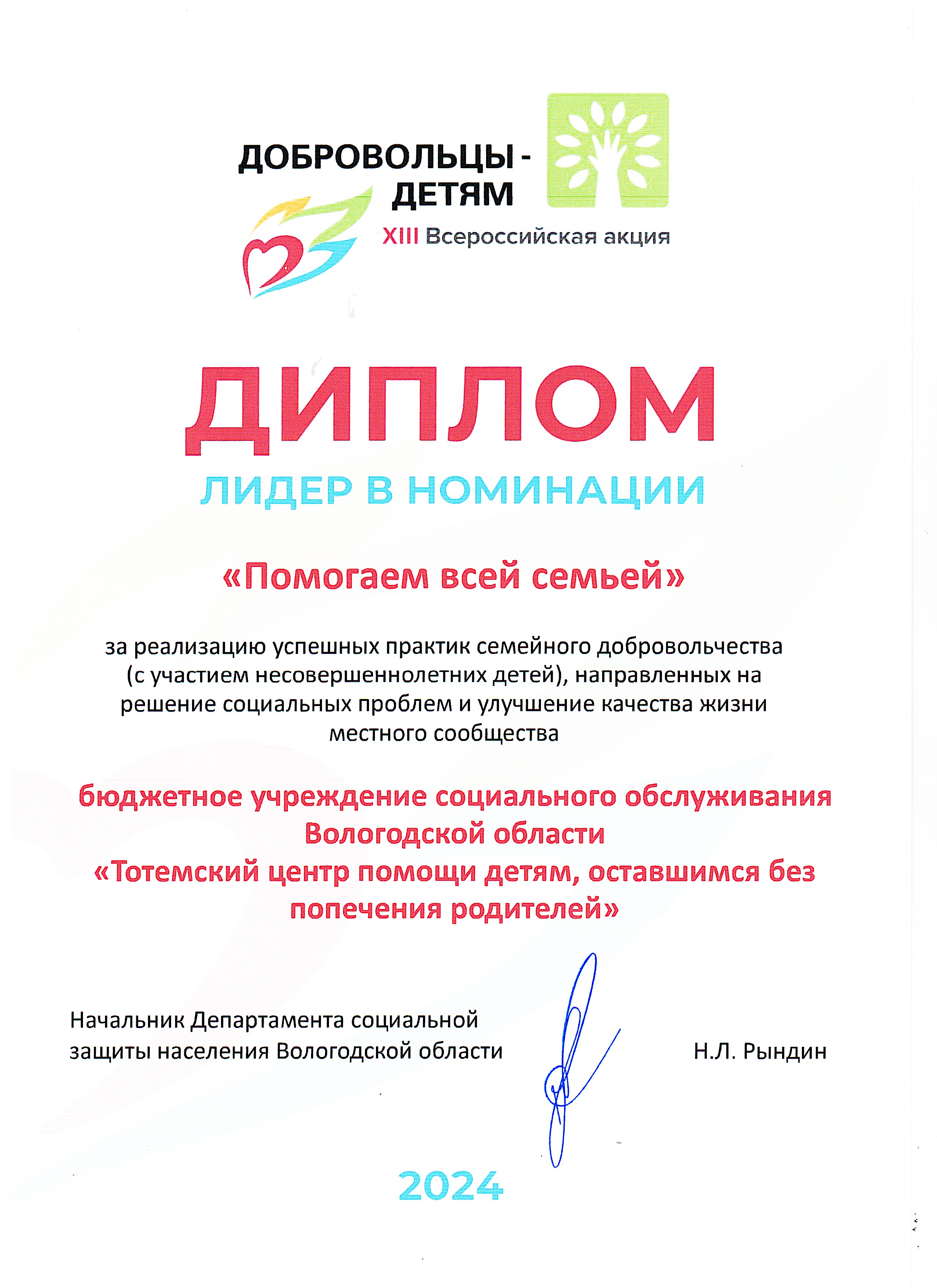 Диплом лидера областной акции «На каникулы в семью»
