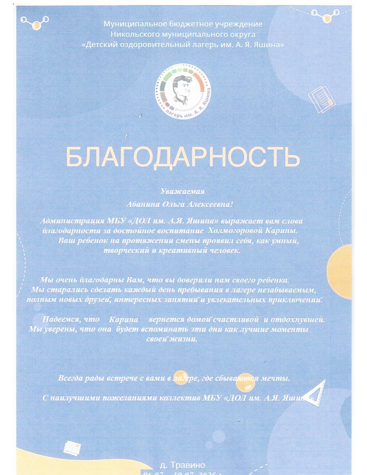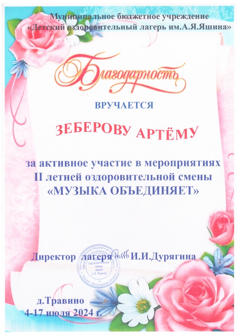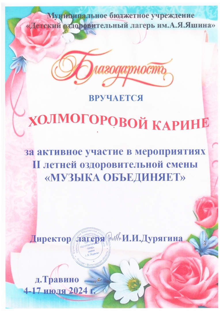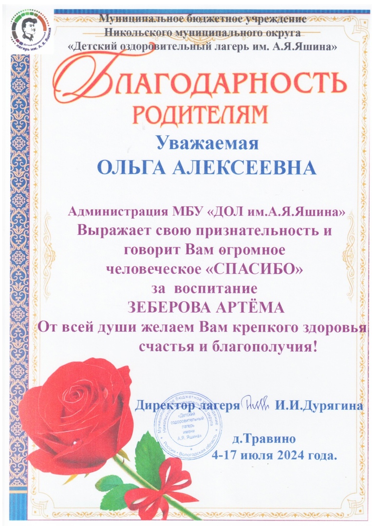 Дурягиной Ирине Ивановне и всему коллективу лагеря за интересный отдых и