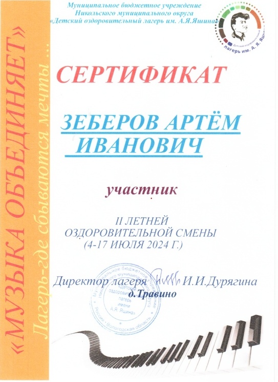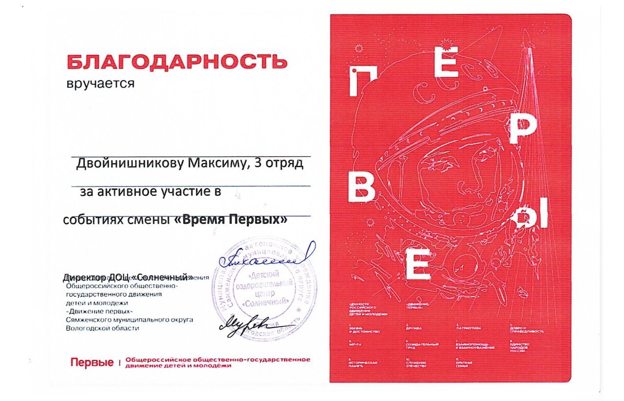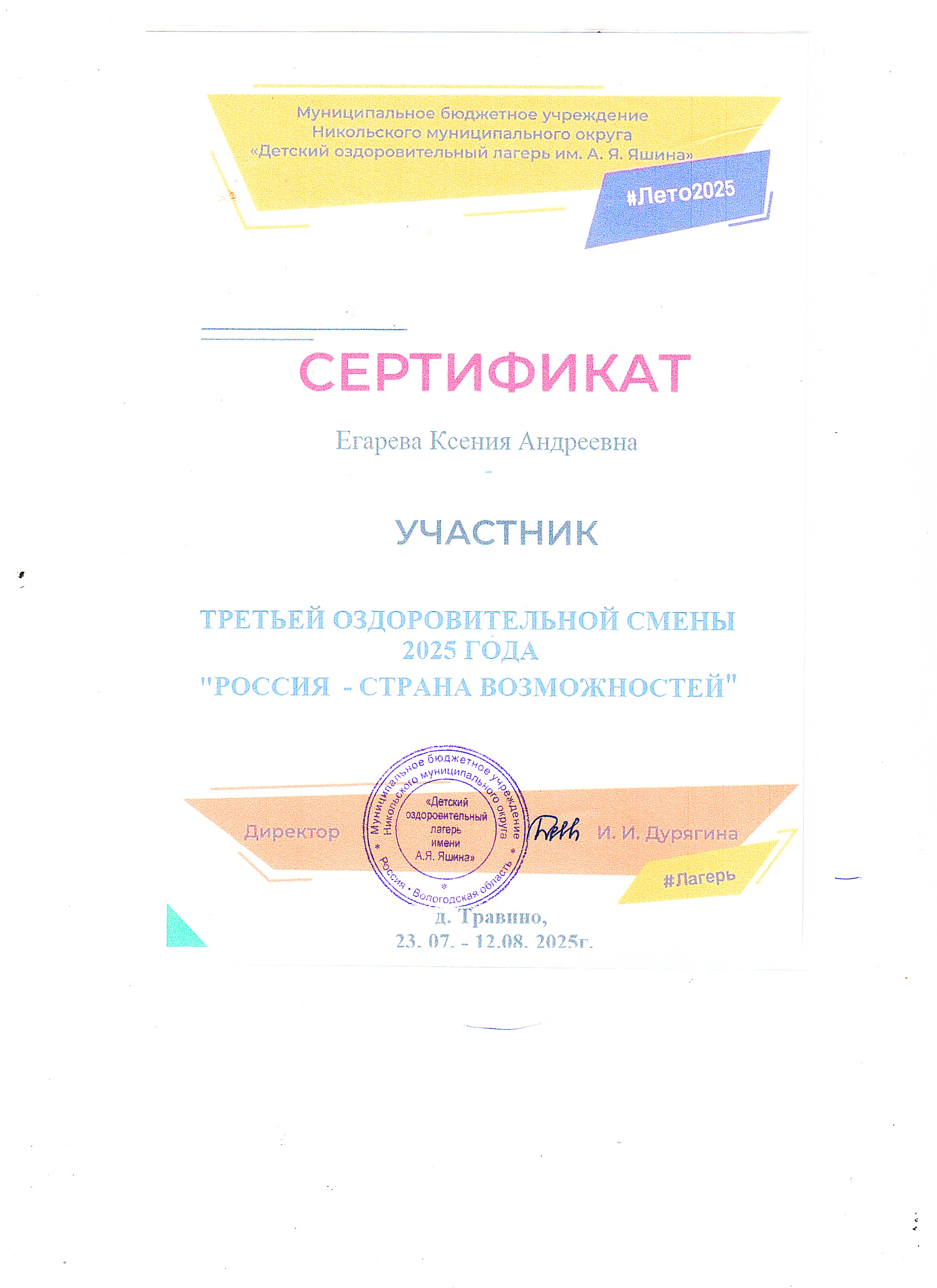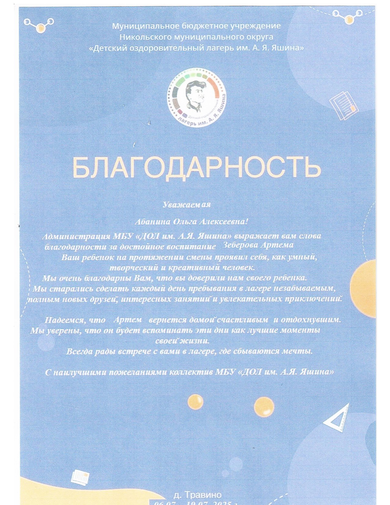 Дурягиной Ирине Ивановне и всему коллективу лагеря за интересный отдых и