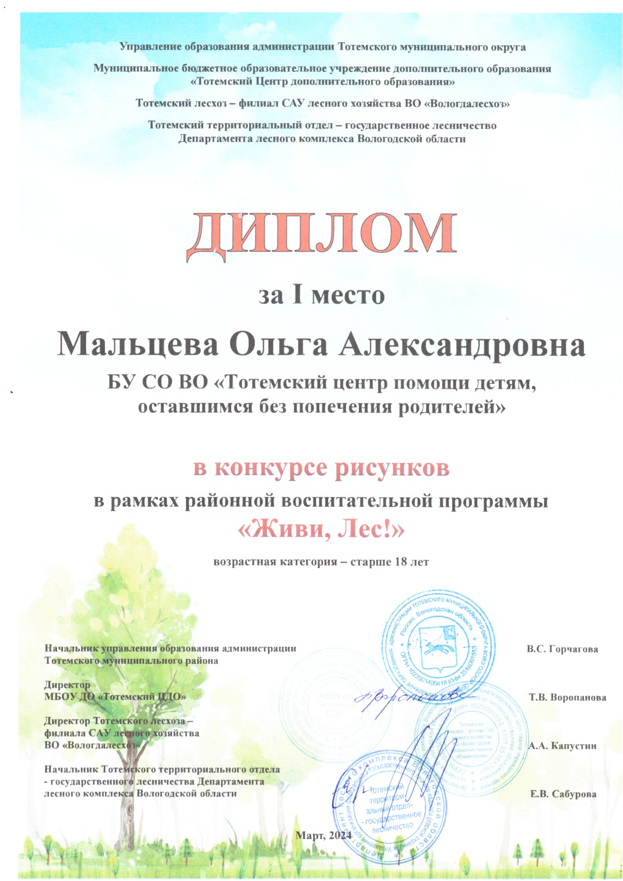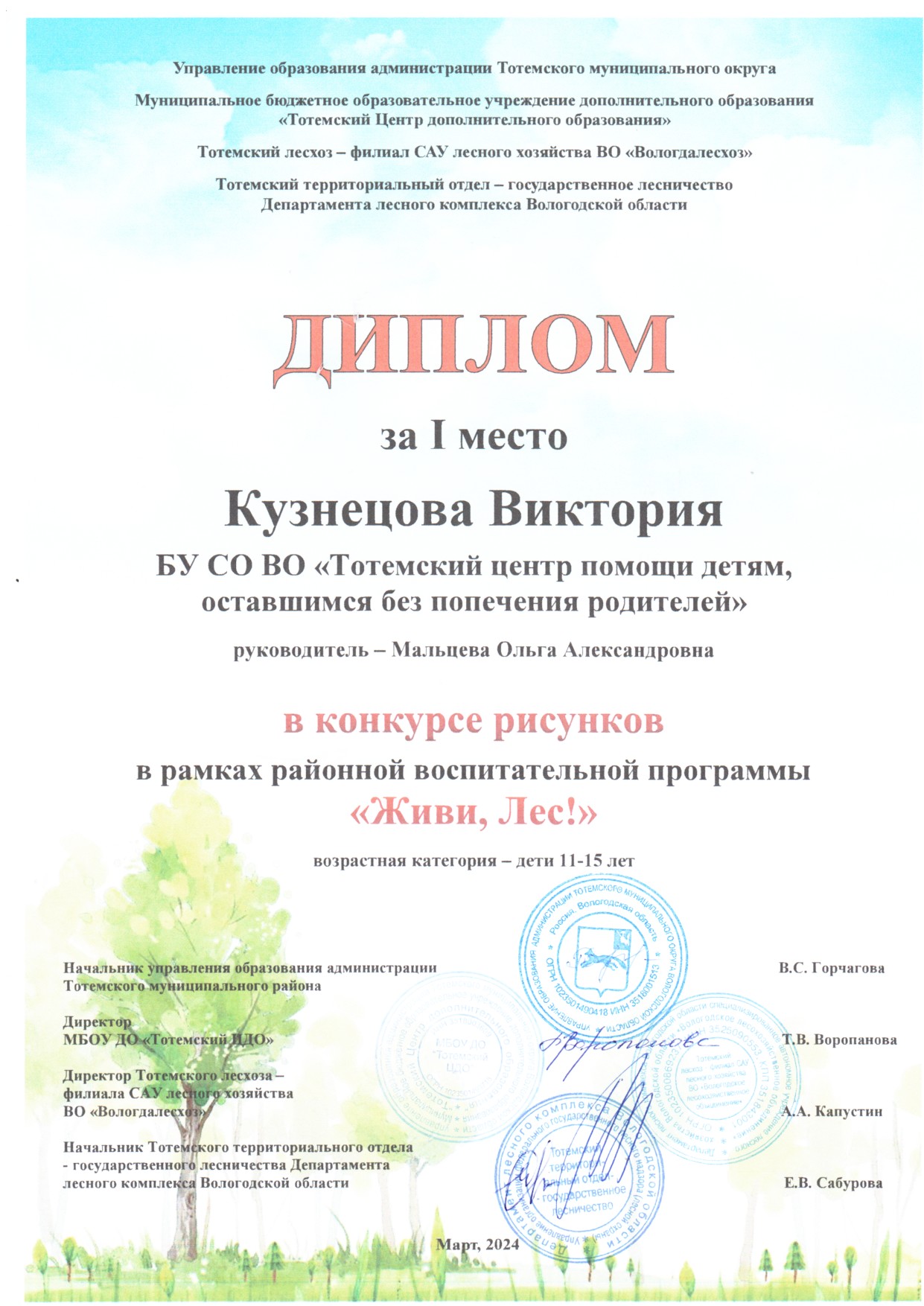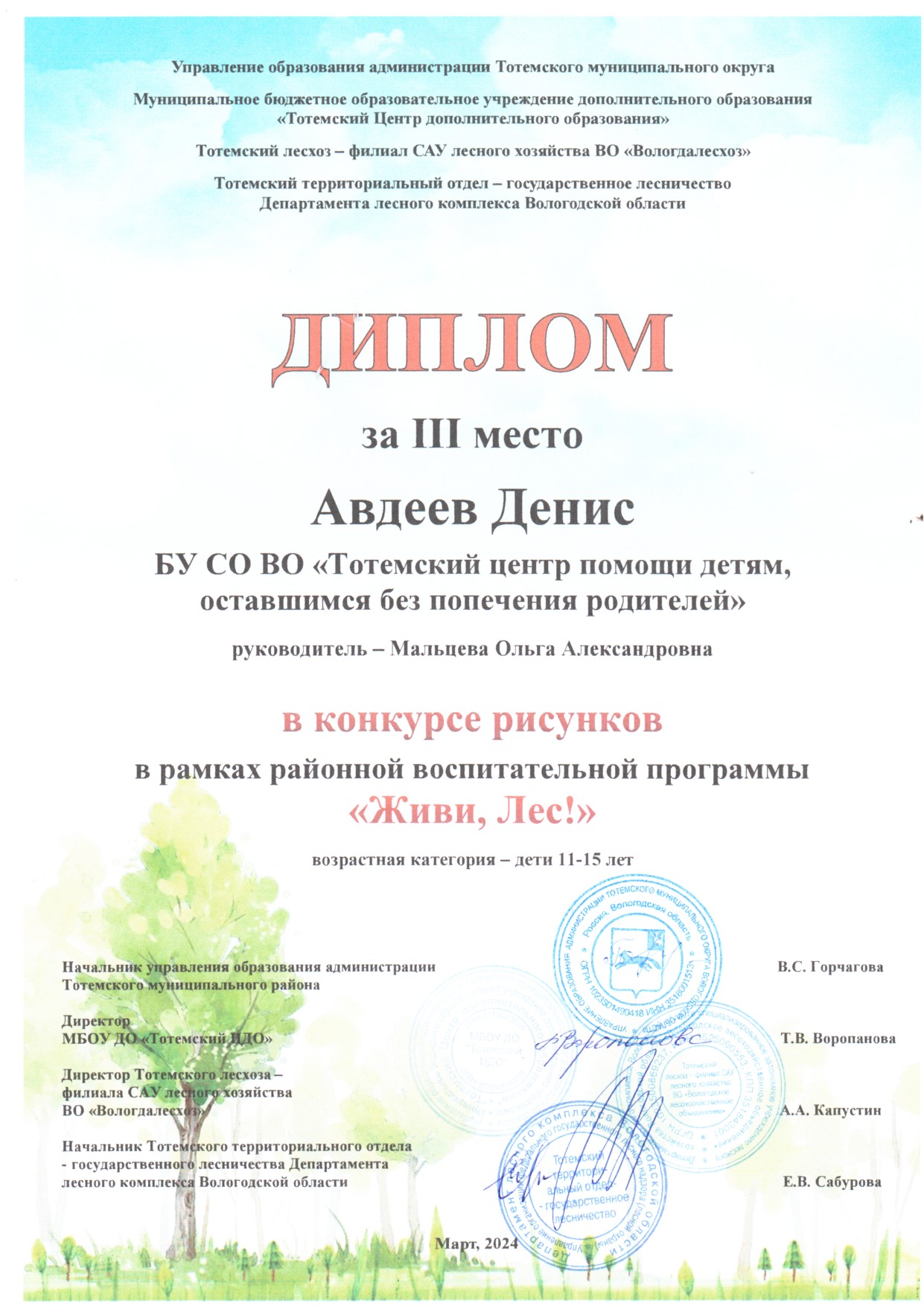 Конкурс рисунков в рамках районной воспитательной программы "Живи, Лес!" (март 2024 года)
